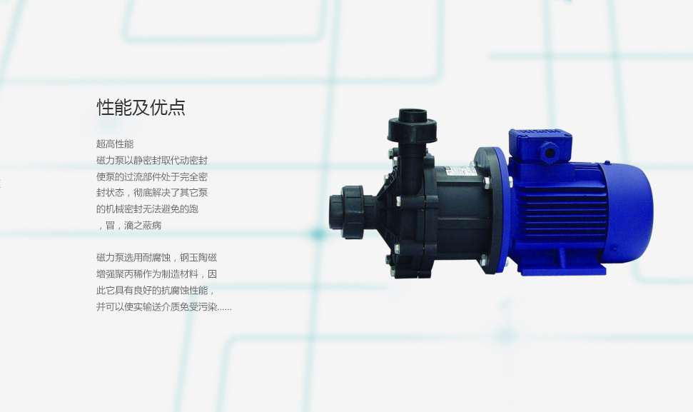 CQF系列磁力工程塑料離心泵是利用永磁聯(lián)軸器工作原理無接觸的傳遞扭矩的新型泵,當原動機帶動外磁鋼轉動時,通過磁場的作用驅動內(nèi)磁鋼轉子同步旋轉,而內(nèi)磁鋼轉 子和葉輪連成一體,從而達到無接觸帶動葉輪轉動之目的。由于液體被封閉在靜止的隔離套內(nèi),所以磁力泵是一種全封閉、無泄漏的產(chǎn)品,因此完全杜絕了機械密封 離心泵不可避免的跑、冒、滴、漏的弊病。